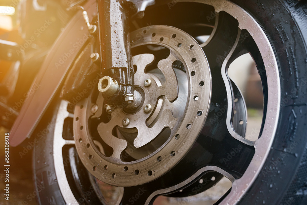 Obraz na plátně Wheel and disc brake system of a motorcycle close-up.