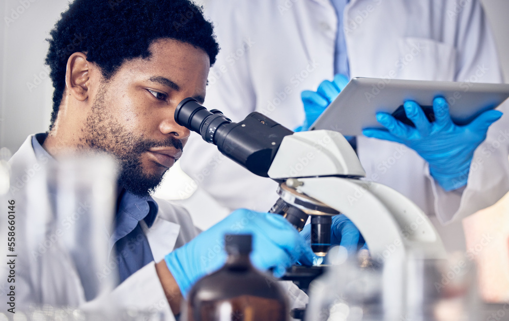 Obraz na plátně Black man, scientist and microscope with science research in laboratory, data analysis and expert with scientific or medical innovation