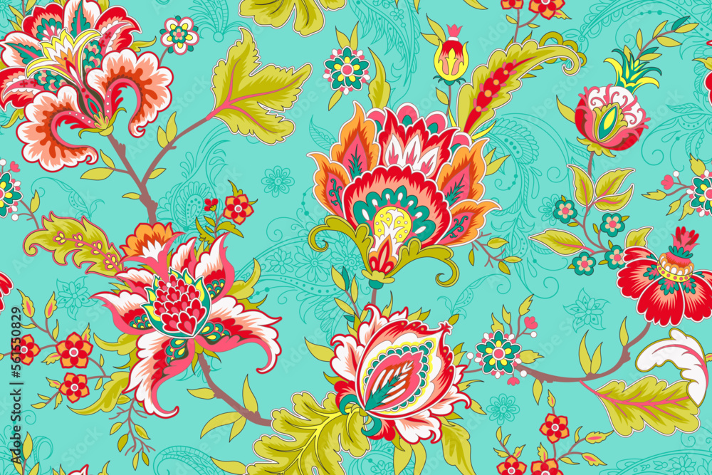 Obraz na plátně Wallpaper fabric with ethnic jacobean flowers on decorative branch, Indidan vint