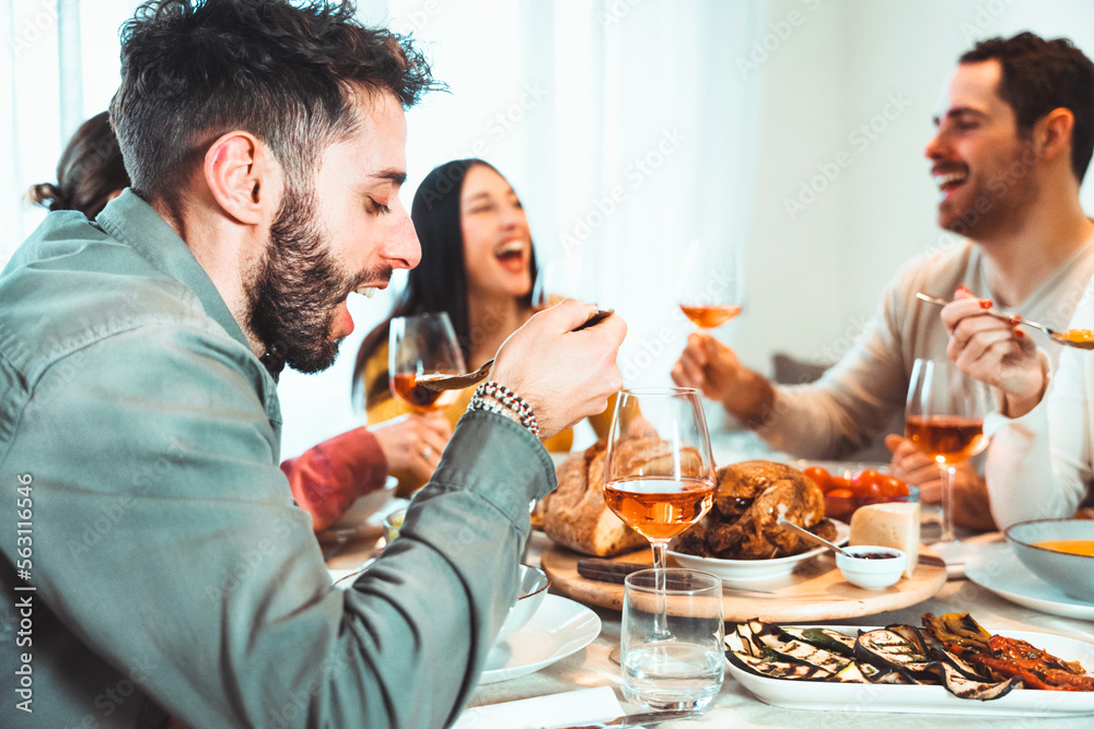 Obraz na plátně Group of happy friends having dinner at home party-Young smiling people eating