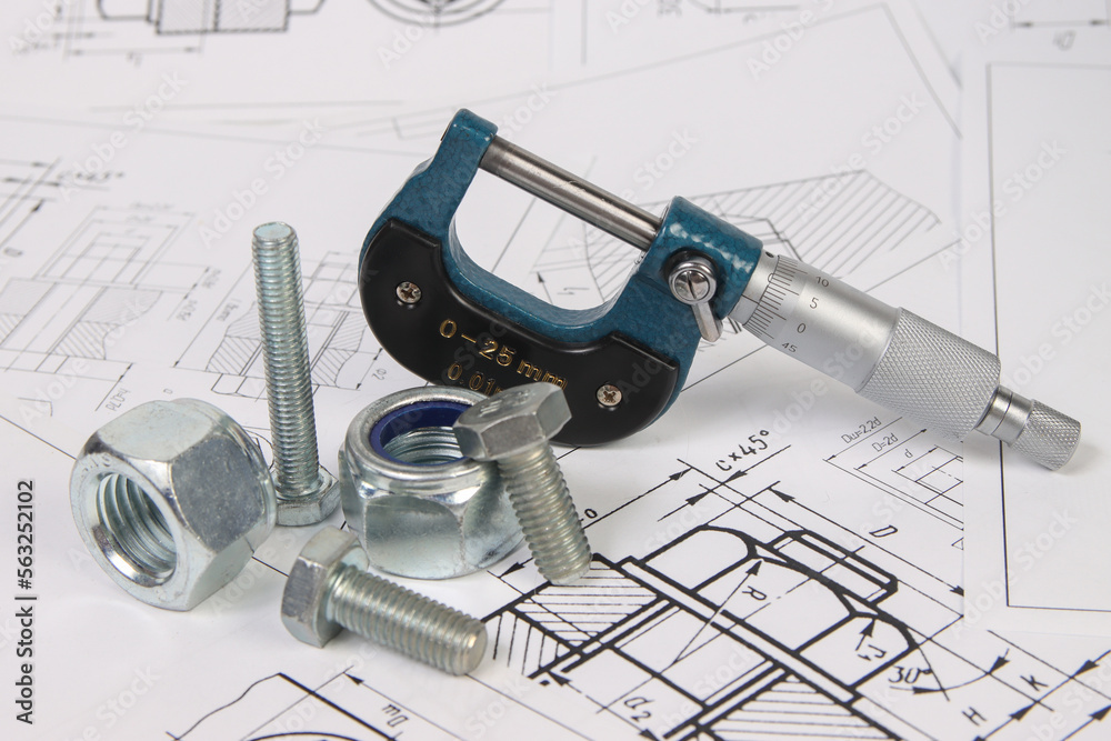 Obraz na plátně micrometer and hardware on a background of engineering drawings
