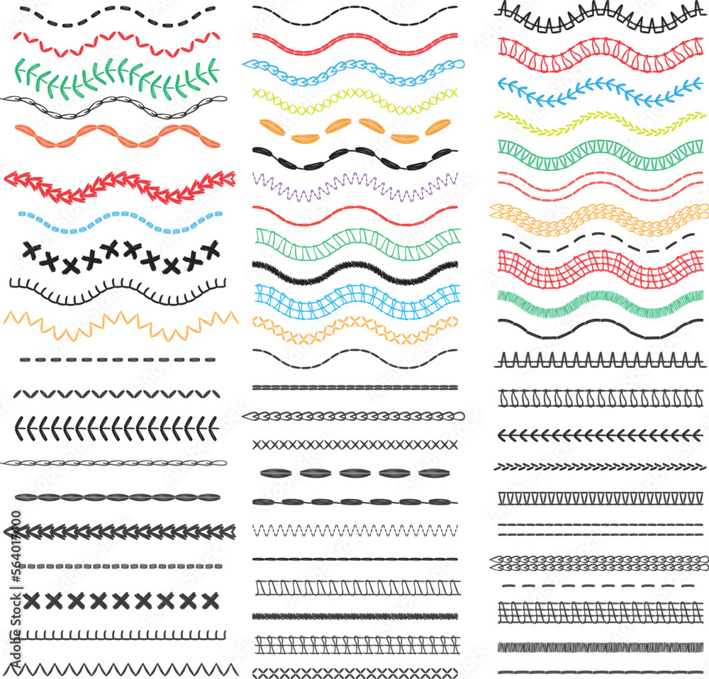 Obraz na plátně Collection of Embroidery Sewing stitches sew seamless brush strokes 002