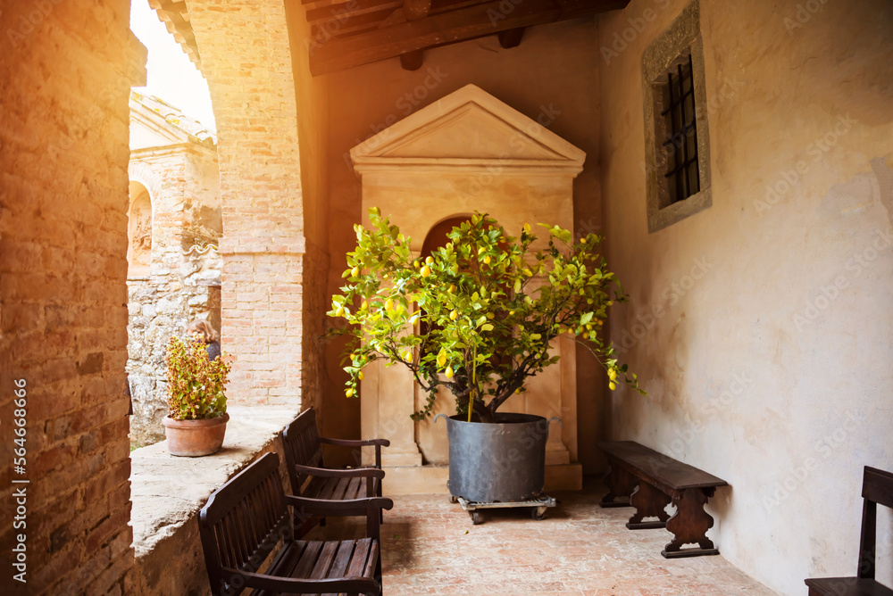 Obraz na plátně Inner yard or porch of an old church with benches and lemon tree
