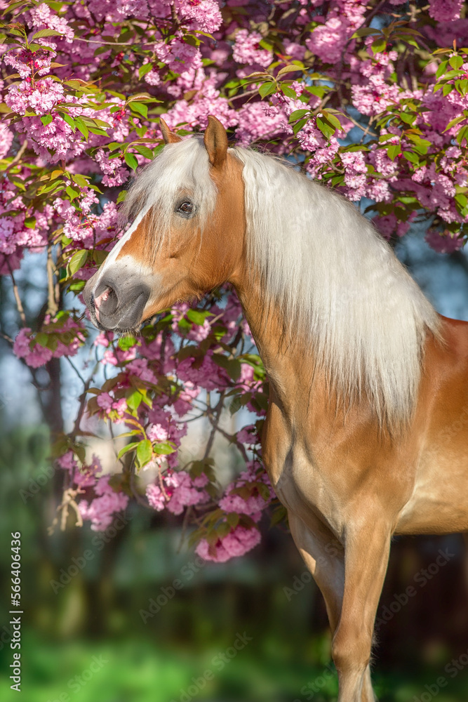 Obraz na plátně Portrait of a haflinger horse with sakura