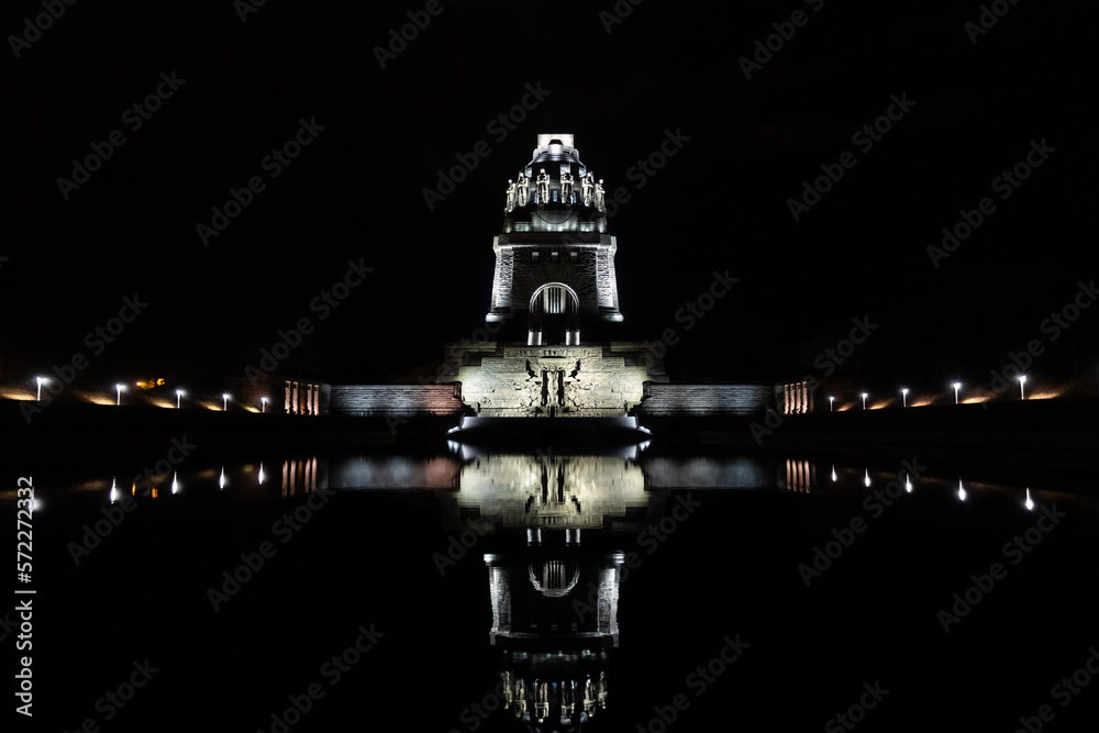 Obraz na plátně Night shot of the Monument to the Battle of the Nations in Leipzig, reflection on the water, symmetrical perspective, landmark and commemoration of the Battle of the Nations in 1813
