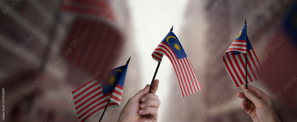 Obraz na plátně A group of people holding small flags of the Malaysia in their hands