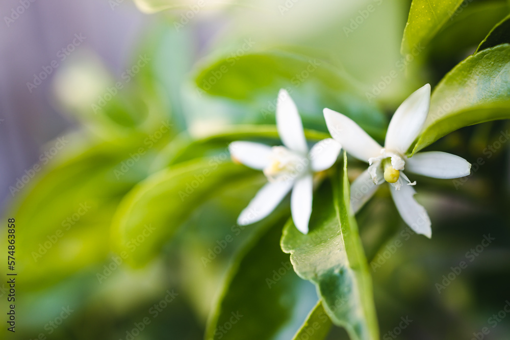 Obraz na plátně tahitian lime plant with white flowers, close-up shot at shallow depth of field