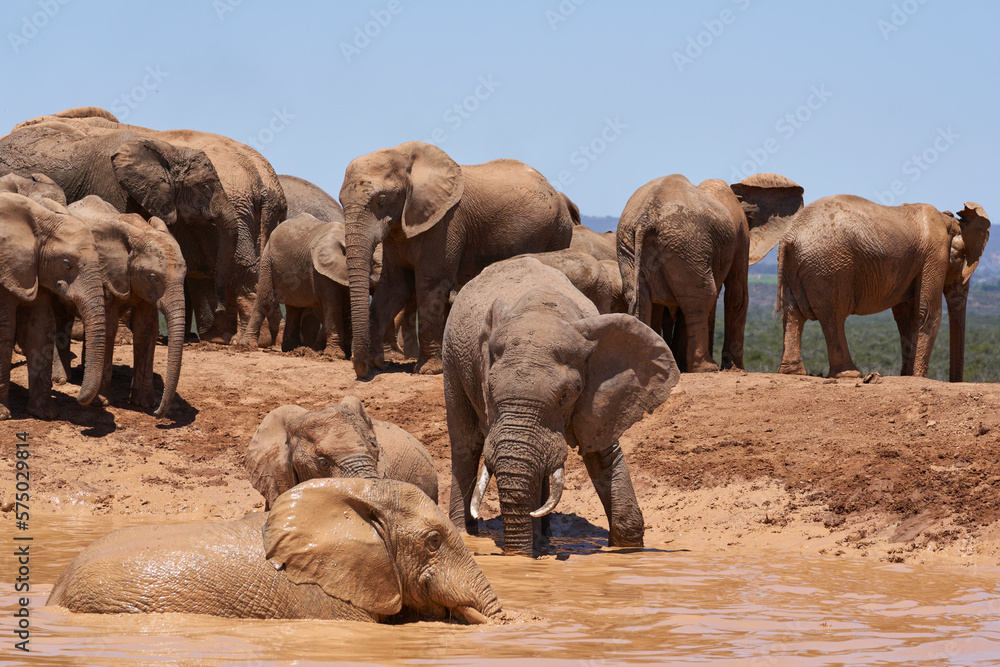 Obraz na plátně African elephants (Loxodonta africana) bathing at a muddy waterhole in Addo Elep