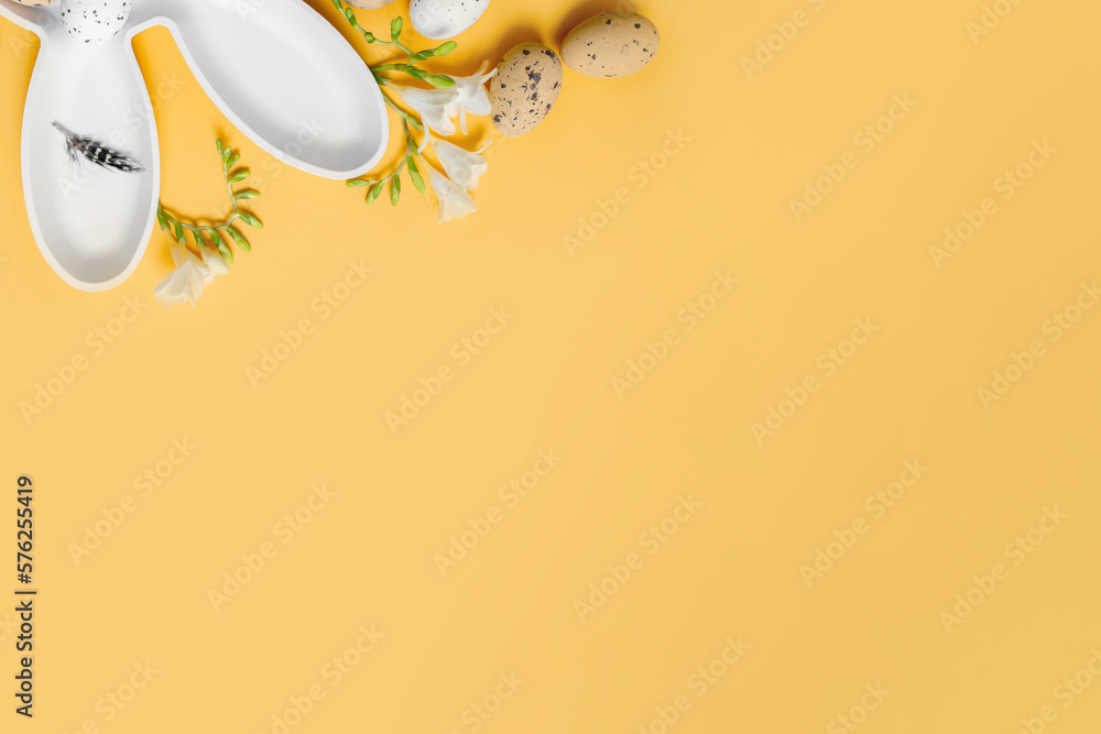 Obraz na plátně creative easter layout with white plate bunny and easter eggs on yellow background