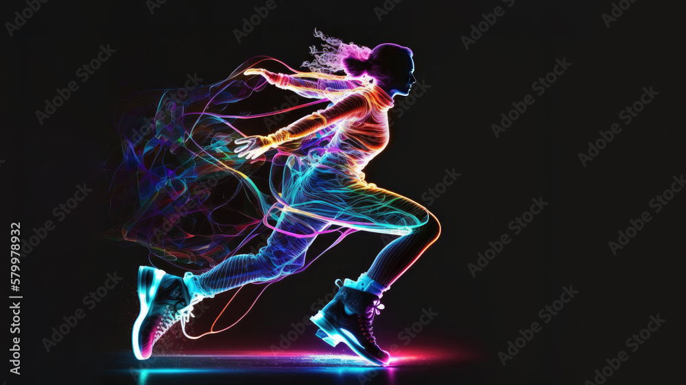 Obraz na plátně Figure ice skating female silhouette neon glowing, impetuous neon girl shape ice skating, beautiful sport image on solid black background