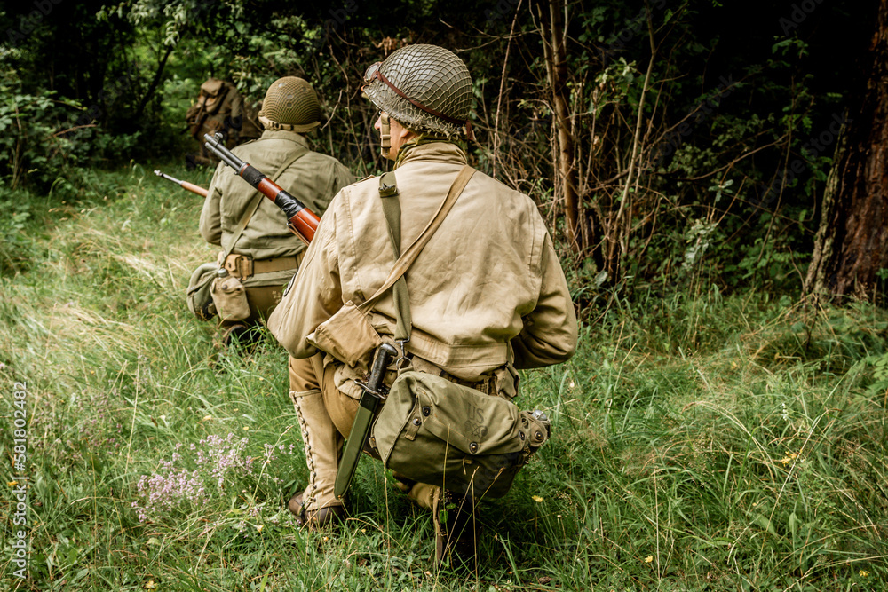 Obraz na plátně Historical reeneactors dressed As american Infantry Soldier during World War II patrol the forest