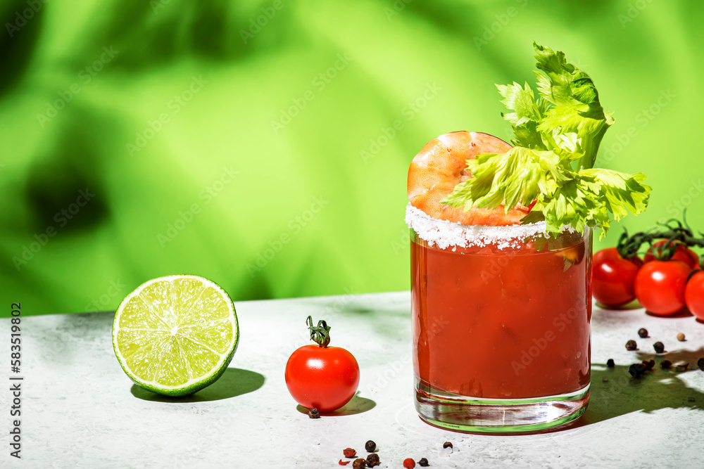Obraz na plátně Bloody Caesar alcoholic cocktail drink, version of Bloody Mary with tomato juice, vodka, clam broth, celery, hot sauce and ice in glass garnished with salt