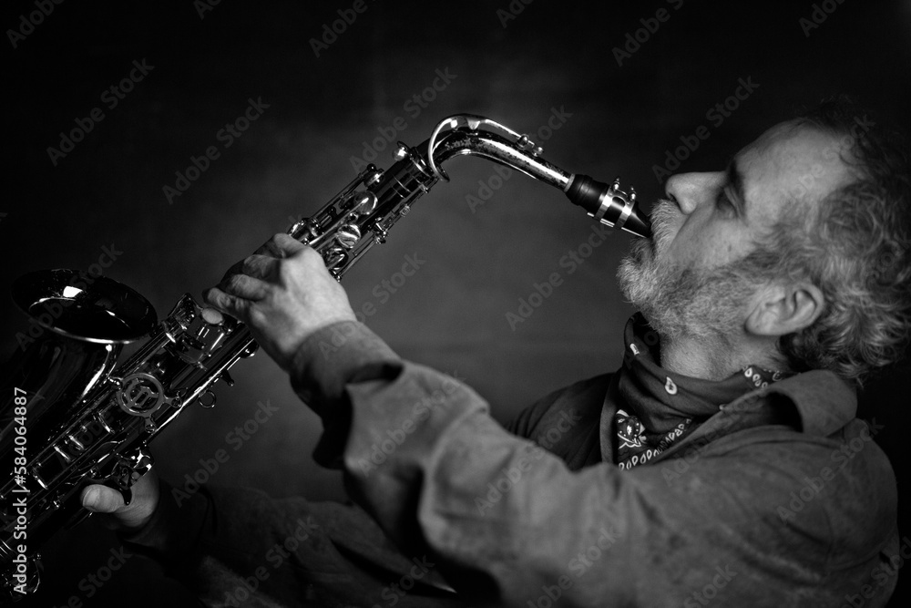 Obraz na plátně Saxophone player Saxophonist playing jazz music instrument Jazz musician playing