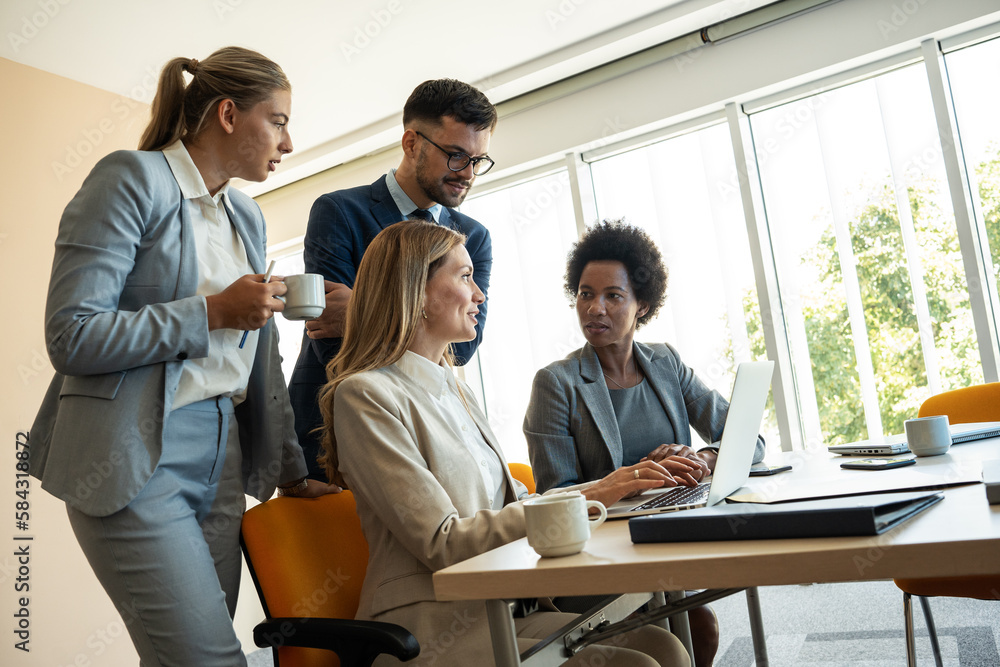 Obraz na plátně In a cozy, casual office, a group of business professionals monitors stock market activity with keen focus and expertise