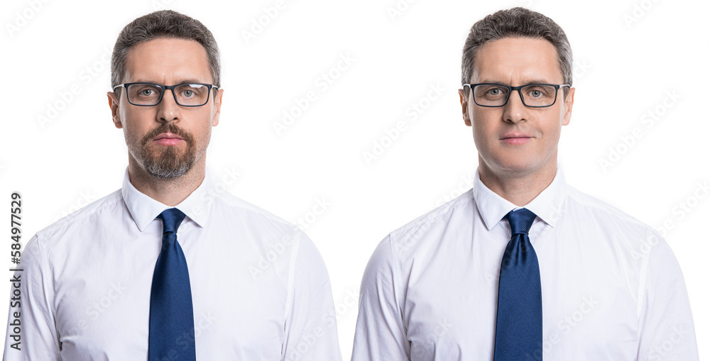 Obraz na plátně guy face stubble collage before and after isolated on white background