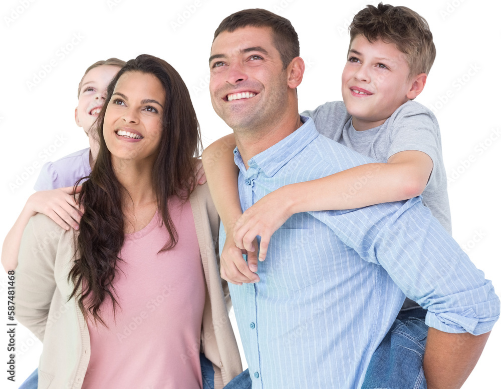 Obraz na plátně Happy parents giving piggyback ride to children while looking up