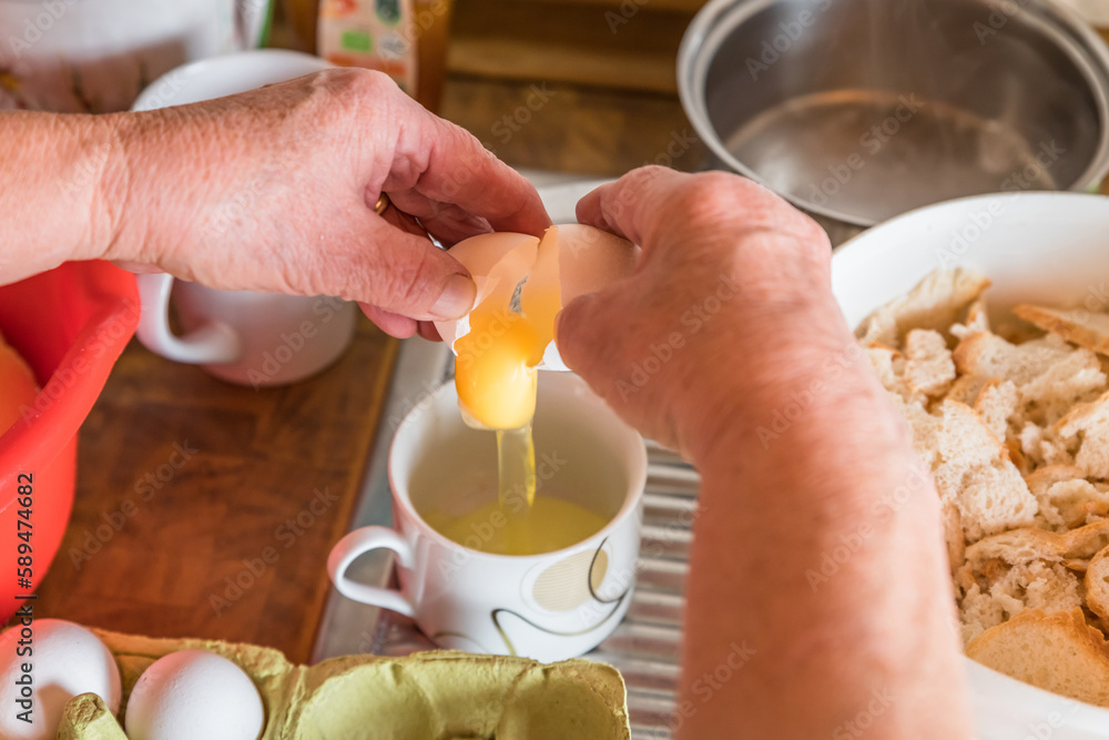 Obraz na plátně Gutbürgerliche Hausfrau Frau Köchin in der Küche schlägt Eier auf und trennt Eig