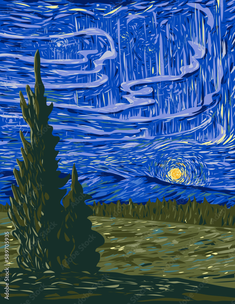 Obraz na plátně WPA poster art of northern lights in Wapusk National Park with starry night in Hudson Bay in Hudson Plains within Manitoba Canada done in works project administration or federal art project style