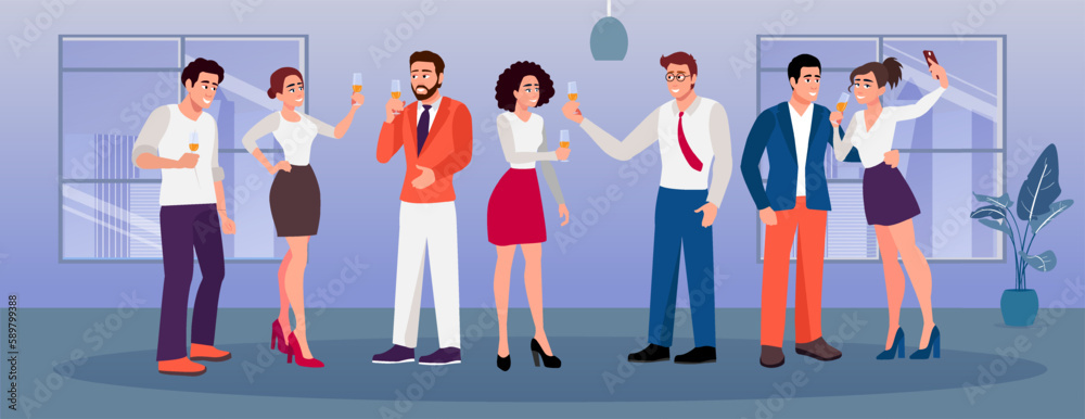 Obraz na plátně Set of cartoon characters of coworkers raising champagne glasses
