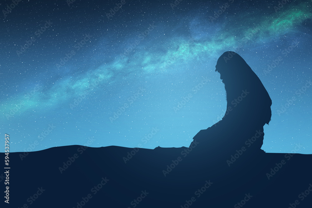 Obraz na plátně Silhouette of a Muslim man with a beard wearing keffiyeh with agal in a praying