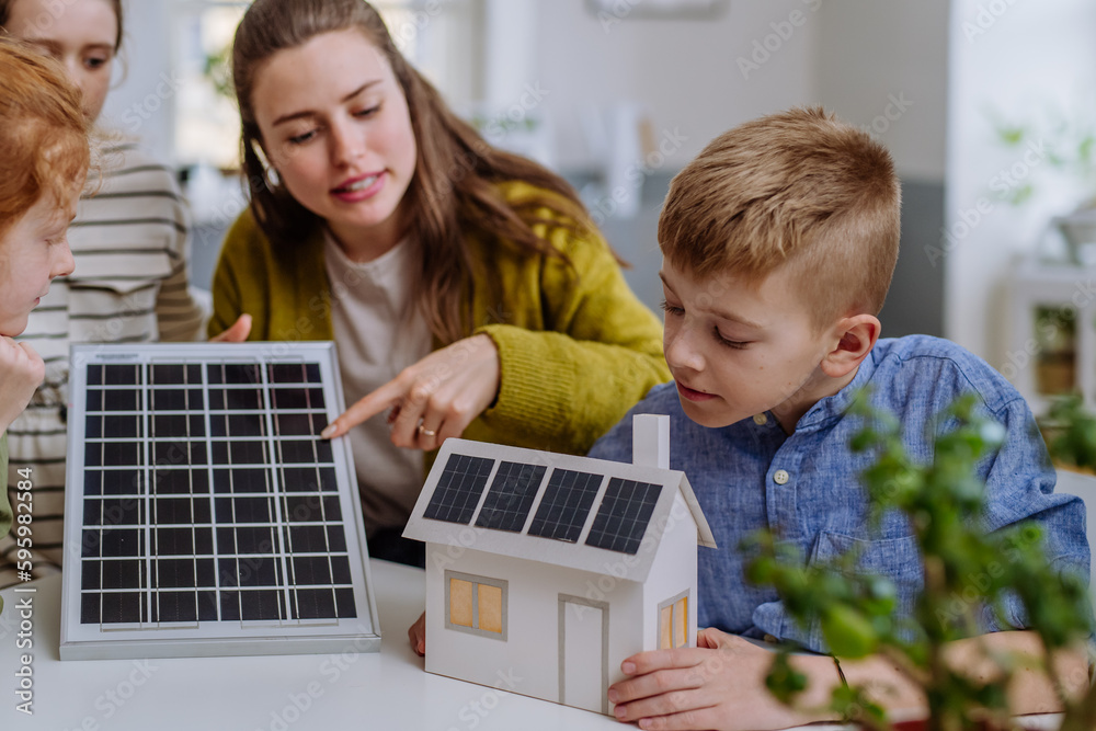 Obraz na plátně Young teacher with solar panel learning pupils about solar energy