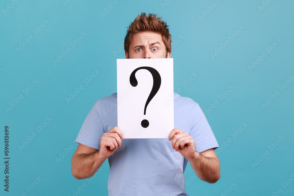 Obraz na plátně Portrait of puzzled bearded man covering half of face with white paper with question mark, finding smart solution, asking for advice