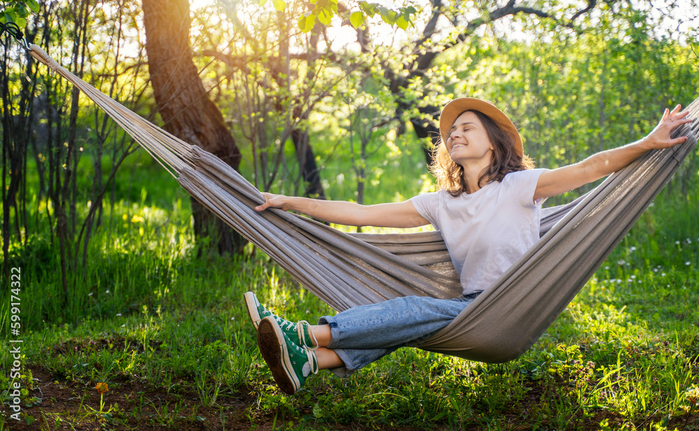 Obraz na plátně Young happy caucasian woman in a hat lying in a hammock in a green garden enjoyi