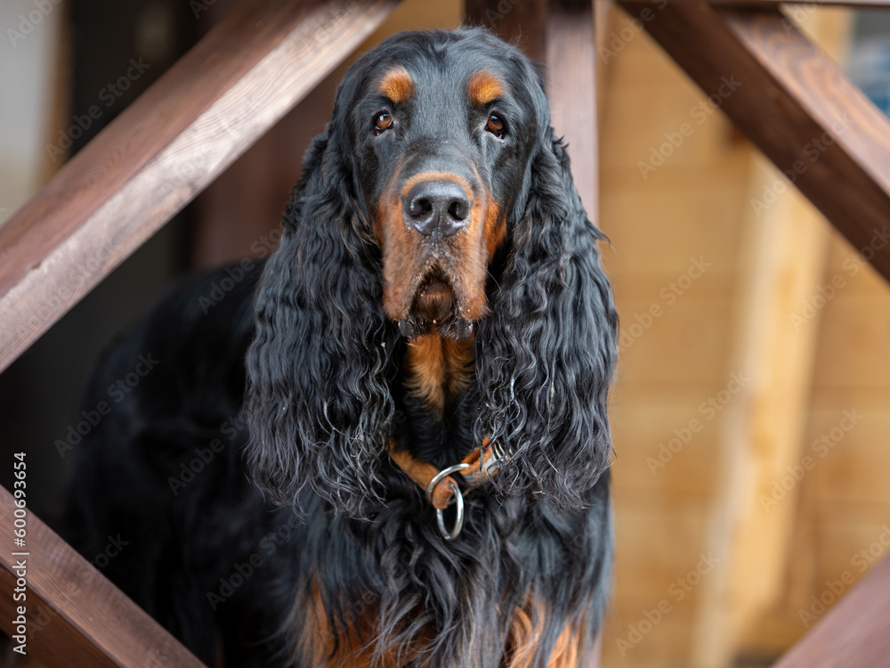 Obraz na plátně Portrait of an adult Scottish setter - Gordon standing between the railing of th