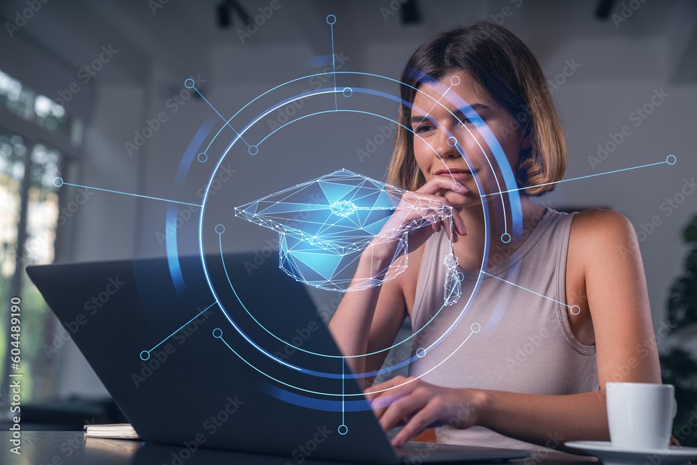 Obraz na plátně Thoughtful businesswoman in casual wear typing on laptop at office workplace with coffee cup