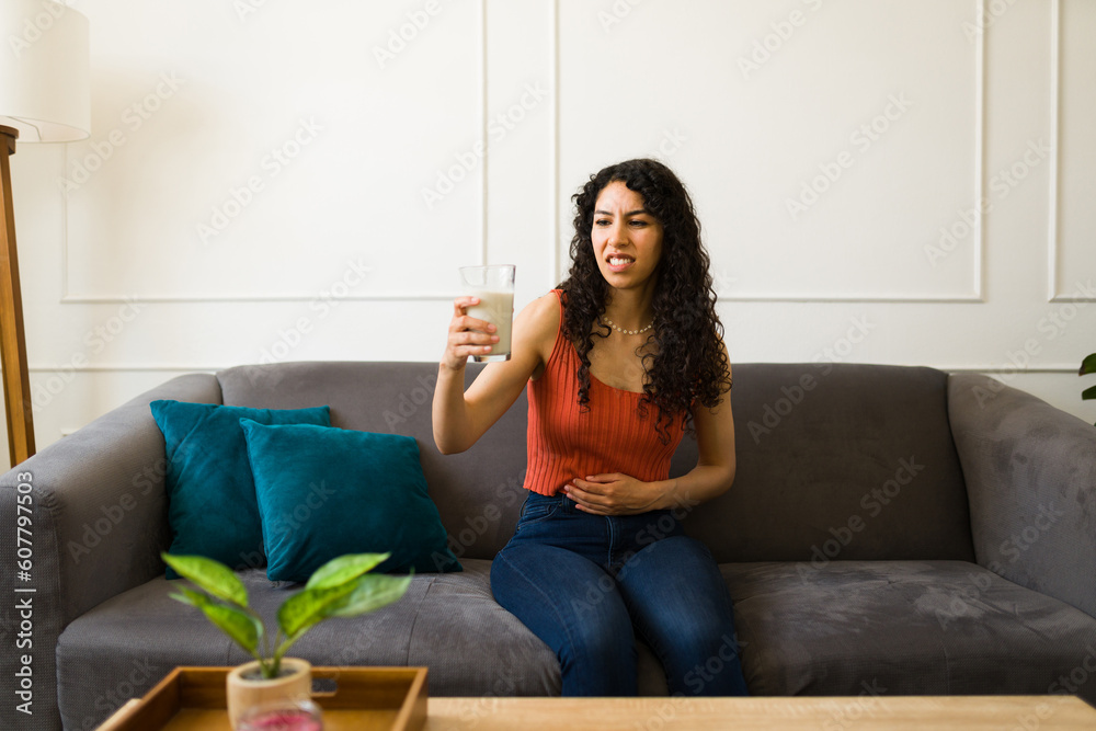 Obraz na plátně Lactose intolerant woman drinking milk and feeling bloated