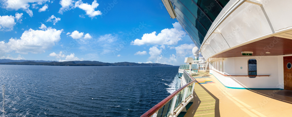 Obraz na plátně Panoramic ocean view with luxury cruise ship heading to vacation from Seattle to Alaska