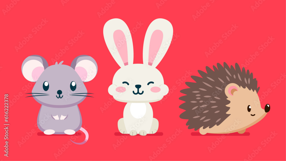 Obraz na plátně Set of cute wild animals, Hedgehog, rabbit, mouse, hamster, Safari jungle animal