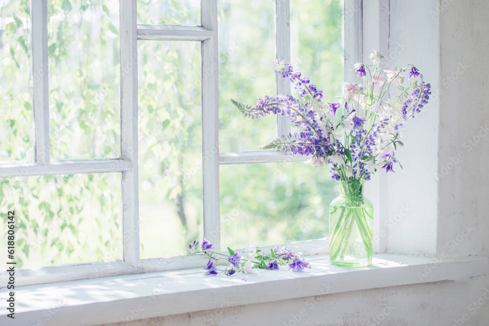 Obraz na plátně summer flowers in vase on windowsill in sunlight