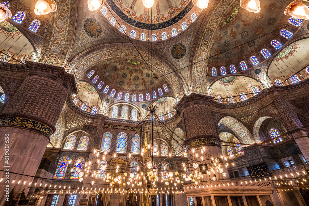 Obraz na plátně Blue Mosque Lights Basilica Domes Stained Glass Istanbul Turkey