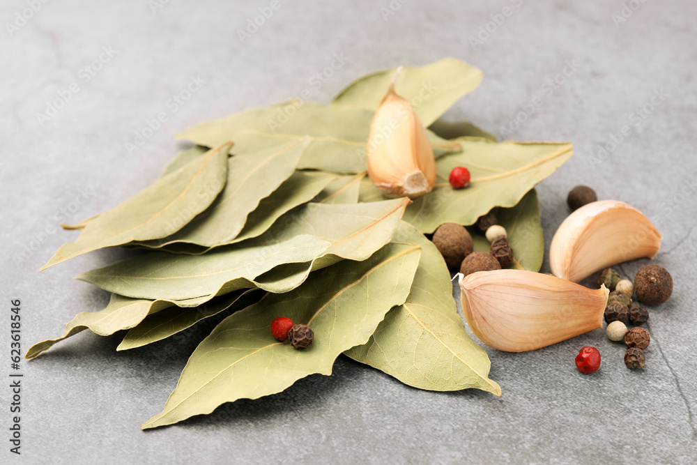 Obraz na plátně Aromatic bay leaves and spices on light gray table, closeup