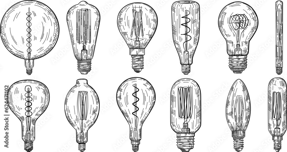 Obraz na plátně Set of hand drawn light bulb in vintage engraved style