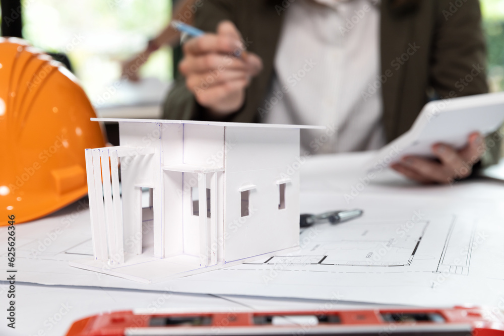 Obraz na plátně Scale model house on table with helmets and female architect working