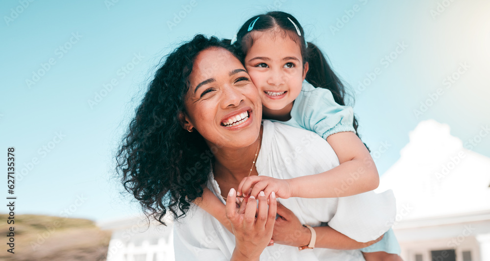 Obraz na plátně Hug, piggyback and mom with her girl child playing outdoor in the garden at their family home