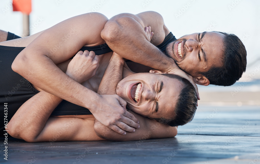 Obraz na plátně Men fight, mma and choke hold outdoor for competition, exercise and workout
