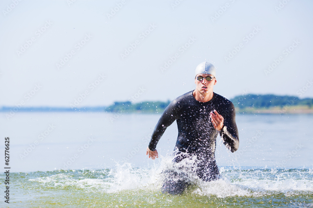 Obraz na plátně Triathlete running out of the water