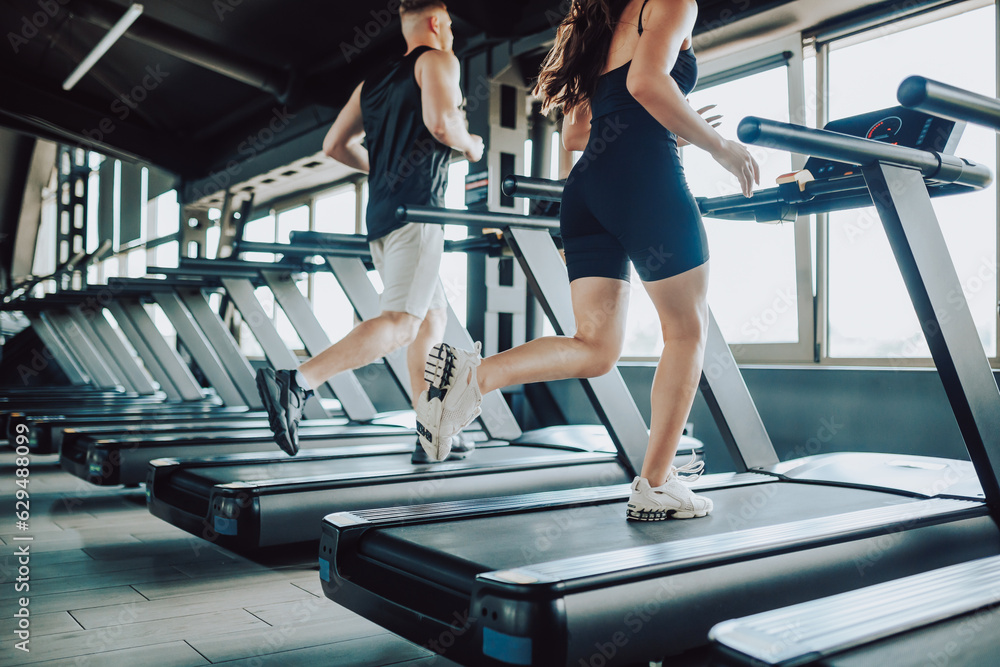 Obraz na plátně Hispanic and American Couple run treadmill Fitness in the Gym