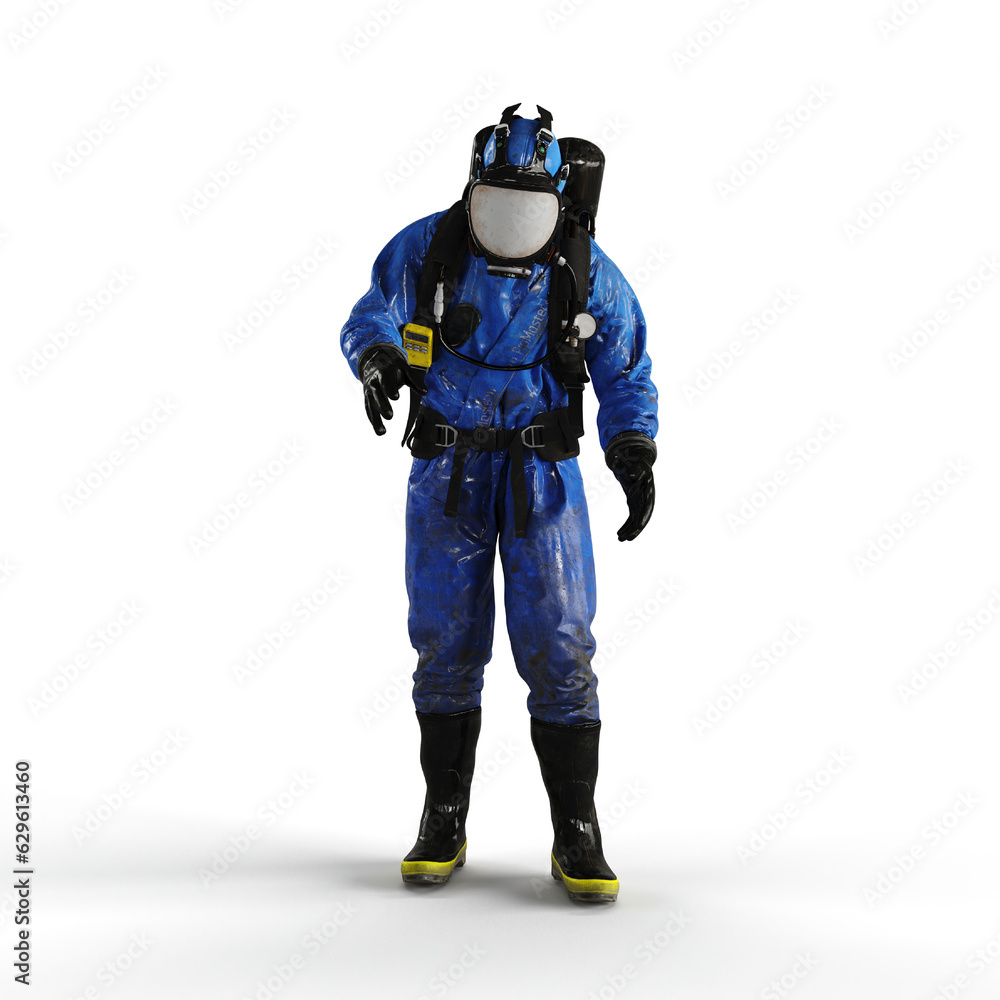 Obraz na plátně 3d rendered of a person wearing a blue gas protective suit, standing on a white