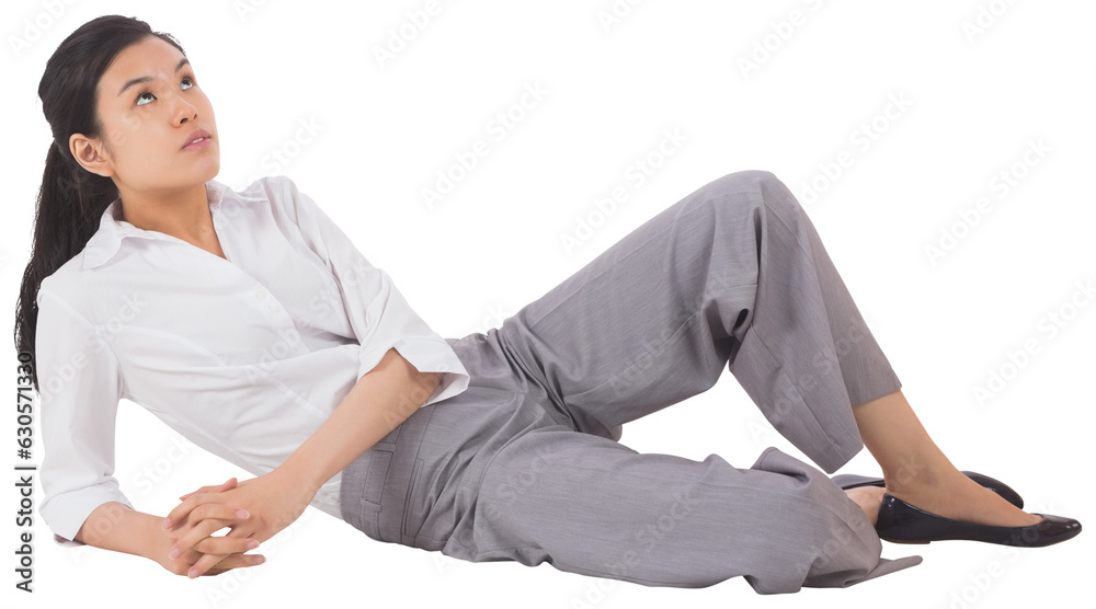 Obraz na plátně Digital png photo of happy asian businesswoman lying down on transparent backgro