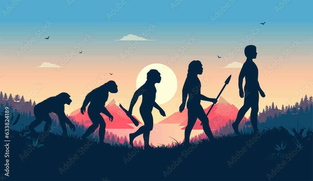 Obraz na plátně Human evolution illustration - Ancestors evolving from primate to modern human in beautiful landscape scene with morning sunrise in background