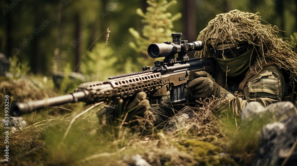 Obraz na plátně Special forces sniper soldier wearing ghillie suit laying on ground hiding with