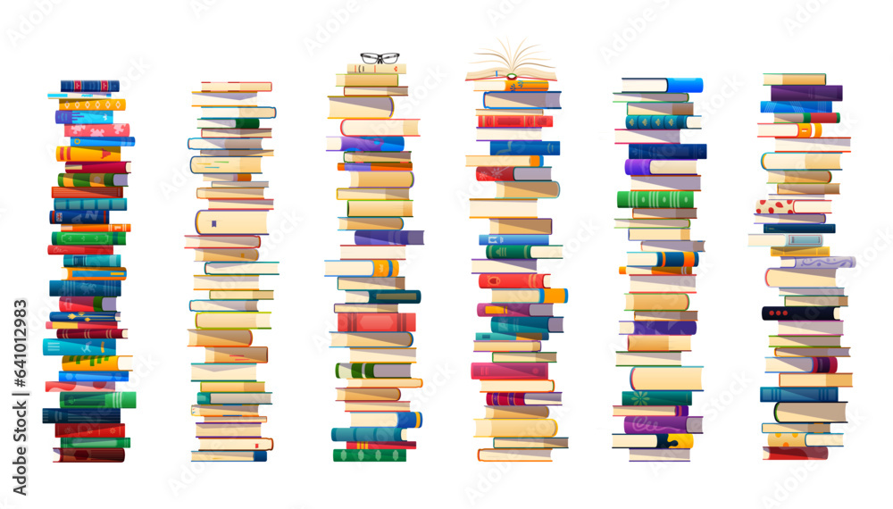 Obraz na plátně High book stacks in piles, school textbooks and library literature heaps, vector tower rows