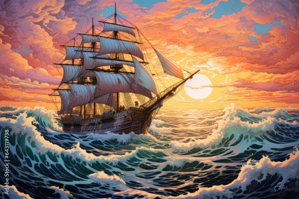 Obraz na plátně anime style picture of a old traditional big sailing ship in the ocean, ai tools