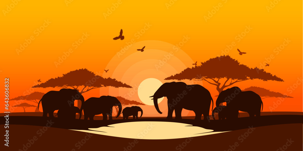 Obraz na plátně Silhouette of Elephants family in sunset, World elephant day, Wildlife and Nature landscape of savanna field, Grassland safari travel, Environmental and Ecology conservation, National park in Africa