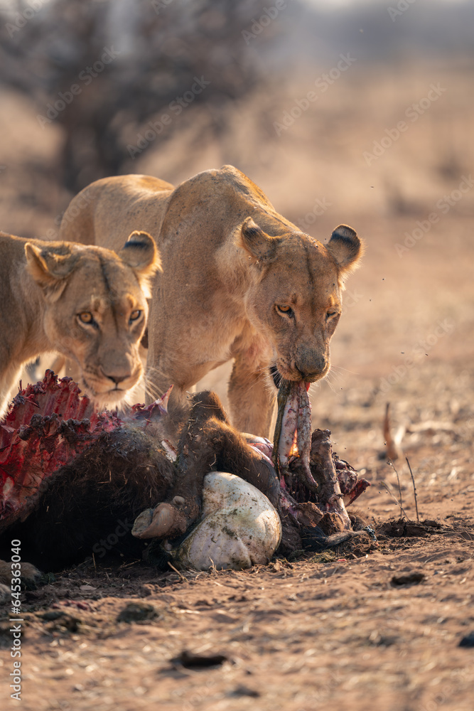 Obraz na plátně Lioness stands eating buffalo carcase with another