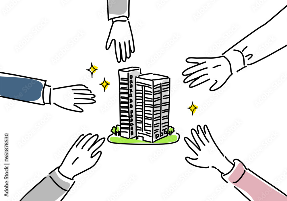 Obraz na plátně ビル建築に力を合わせる人々の手シンプル線画
